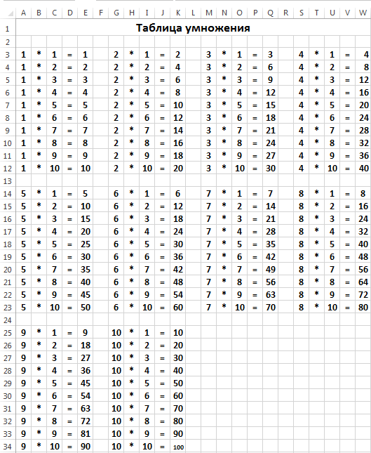 Выделите ячейки А1:W1, объедините их и напишите заголовок «Таблица умножения». Таблица умножения готова: