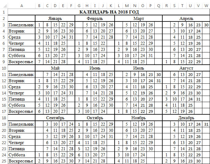 Задание 3. Создание календаря. На Листе 3 с помощью функции Автозаполнение самостоятельно создайте календарь на 2018 год: