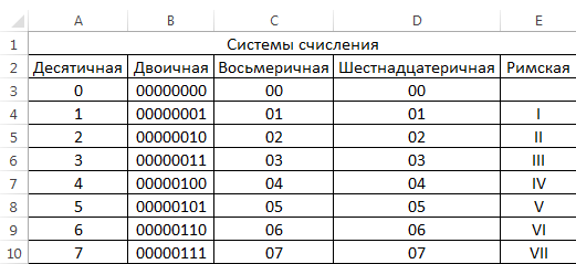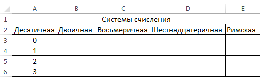 Задание 4. Создание таблицы «Системы счисления». На Листе 4 создайте таблицу, объедините ячейки А1:Е1 и напишите заголовок. Десятичные числа (столбец А) с помощью функции Автозаполнение заполните до 20 (до ячейки А23).