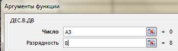 Нажмите ОК. Появится окно Аргументы функции. Для ввода числа щелкните по ячейке А3, разрядность введите 8.