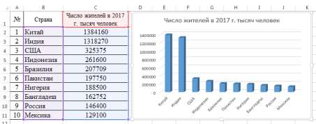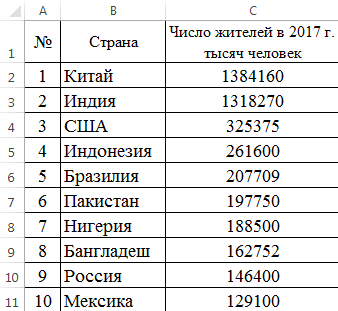 - Заполните таблицу: 10 самых больших стран мира по населению 2017: