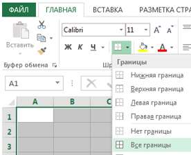 Удерживая нажатой левую кнопку мыши, выделите таблицу из 3 столбцов и 6 строк. Для обозначения границ выделенной области нажмите вкладку Главная Шрифт Границы Все границы: