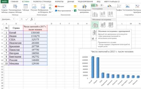- Выделите таблицу вместе с заголовком. Выберите вкладку Вставка Диаграммы Вставить гистограмму Объемная гистограмма с группировкой: