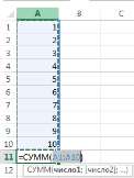 - Введите числа от 1 до 10 в ячейки А1:А10. Выделите ячейку А11.