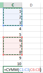 - Для суммирования нескольких диапазонов (например, С1:С3 и С6:С8): выделите ячейку С11, щелкните Автосумма — , выберите мышкой диапазон (С1:С3) и, удерживая [Ctrl], выделите второй диапазон (С6:С8), нажмите Enter.