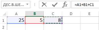 Перейдите на Лист 2. Введите в ячейку А1 – 25, В1 – 5, С1 – 8. Выделите ячейку D1 и введите формулу =A1+B1-C1.