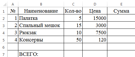 В ячейку Е2 введите формулу для расчета суммы на палатки =С2*D2 и нажмите Enter. Скопируйте содержимое ячейки Е2 в ячейки Е3, Е4 с помощью маркера заполнения. Вычислите общий расход (ВСЕГО) в ячейке Е7.
