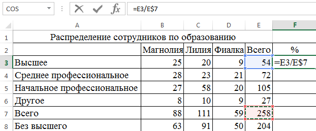 В ячейку F2 введите подзаголовок «%». В ячейку F3 введите формулу =Е3/Е$7. Знак $ означает абсолютную ссылку. Выделите ячейку F3, установите формат Процентный:
