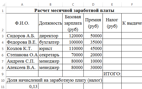 - Выплата за месяц = базовая зарплата + премия — налог. Налог = 13% (ячейка А11).