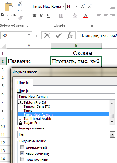 Для того, чтобы в км² «2» сделать надстрочным индексом, выделите «2», откройте диалоговую панель Шрифт и выберите Видоизменение надстрочный: