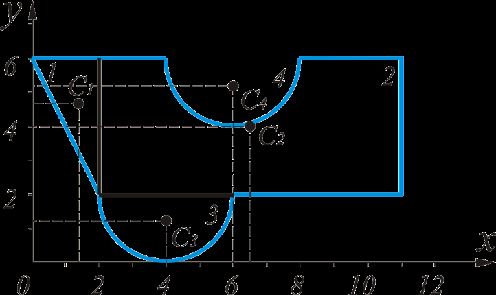 Определим площадь Si и координаты центра тяжести xCi, yCi каждой фигуры с учетом расположения плоской фигуры относительно системы координат 0xy.