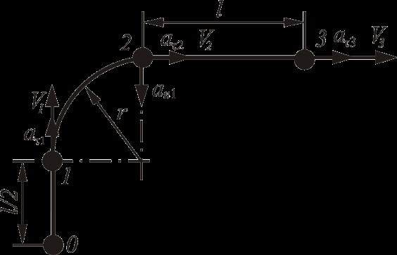 В положении 1 и 3 нормальное ускорение an1 = an3 = 0, так как на участке 0–1 и 2–3 точка совершает прямолинейное движение. В положении 2 нормальное ускорение определим по формуле: