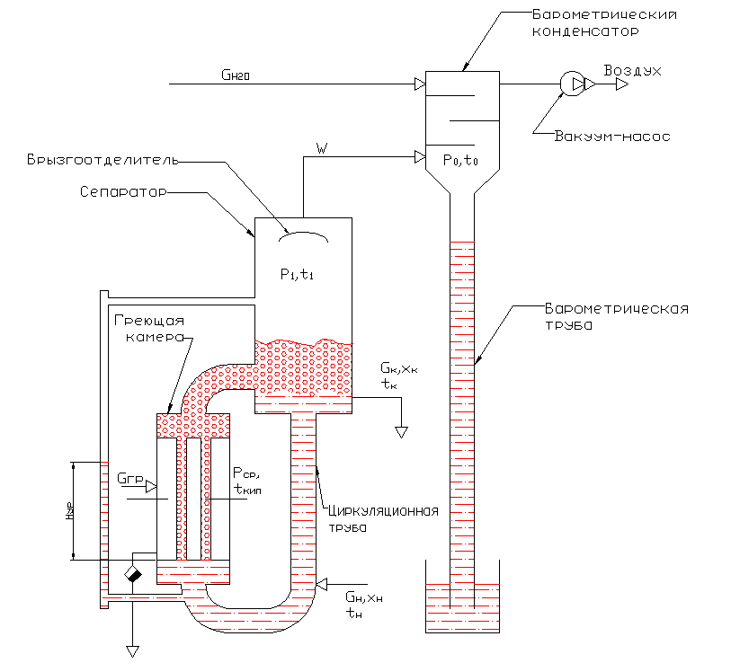 Греющий пар подают в межтрубное пространство, где он конденсируется. Теплота передается через стенки трубок раствору, который кипит. Парожидкостная смесь поступает в сепаратор, где пар отделяется от раствора. Естественная циркуляция возникает из-за разности плотностей сред в циркуляционной трубе и кипятильных трубках.
