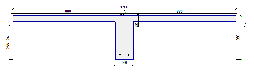 Вторые потери: 5. Потери от усадки бетона: ∆σsp5 = εb,sn∙Es = 0,0002∙2∙10^5 = 40 МПа. 6. Потери от ползучести бетона: ∆σsp6 = (0,8∙α∙φb, cr∙σвр) / (1 + α∙μsp(1 + ys^2/Ared/Ired)∙(1 + 0,8∙φb,cr)). φb,cr = 2,3. σвр — напряжение в бетоне на уровне центра тяжести группы стержней напрягаемой арматуры: σвр = P(1)/Ared + P(1)∙eop^2 / Ired = 233505,72 / (1313,205∙10^2) + 233505,72∙(266,124 — 30)^2 / (2278586,183∙10^4) = 2,35 МПа. P(1) = 232,39 кН. ∆σsp6 = 5,03 МПа. Полные потери: ∆σsp(2) = 186,95 МПа. Mcrc = Rbt,ser ∙ Wpl,int + P(2)∙(eop + r) = 89,82 кН∙м. Mtot = 76,81 кН∙м. Поскольку Mtot < Mcrc, то трещины в нижней зоне не образуются.