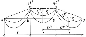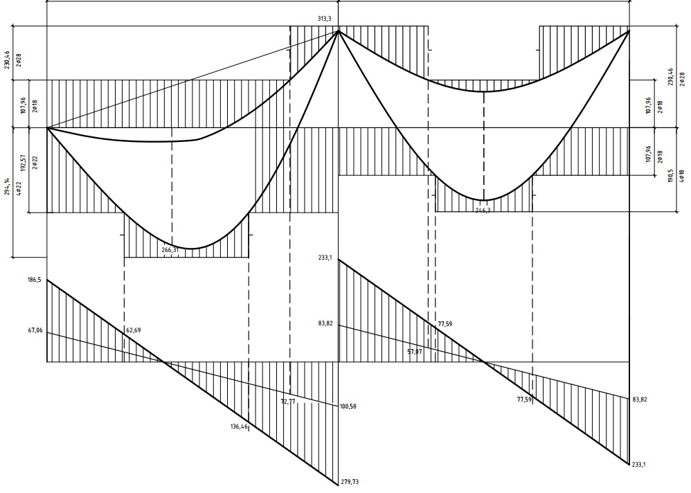Изгибающие моменты: M1q = 323,25 кН∙м; M2q = 250,97 кН∙м; M3q = 439,2 кН∙м; Mg = 151,16 кН∙м. Поперечные силы: Qслева = 203,69 кН; Qсправа = 305,53 кН.