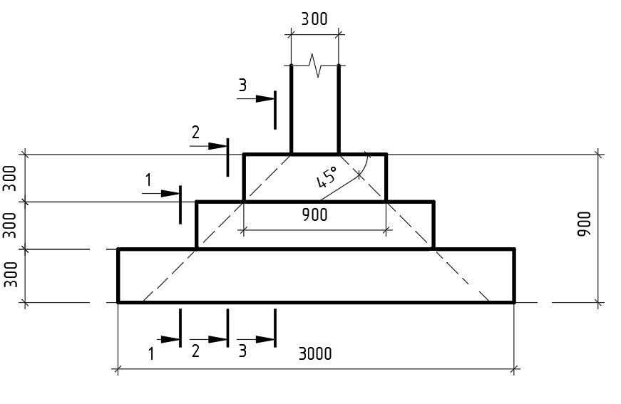 Размер стороны квадратной подошвы: а = 3 м. Высота фундамента: Hô = 900 мм.