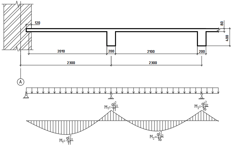- В первом пролете и на первой промежуточной опоре: М1 = q∙l01^2 / 11 = 15,17∙2,01^2 / 11 = 5,57 кН∙м