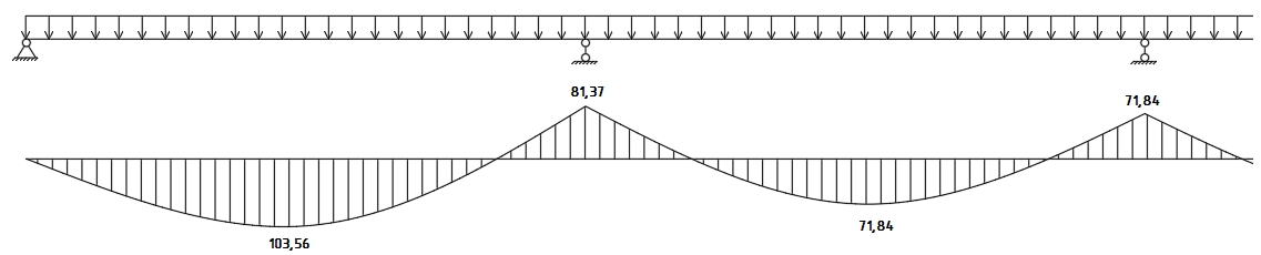 Изгибающие моменты с учетом перераспределения усилий в балке: М1 = q∙l01^2 / 11 = 36,651∙5,575^2 / 11 = 103,56 кН∙м; М2 = q∙l01^2 / 14 = 36,651∙5,575^2 / 14 = 81,37 кН∙м; М3 = q∙l02^2 / 16 = 36,651∙5,6^2 / 16 = 71,84 кН∙м.