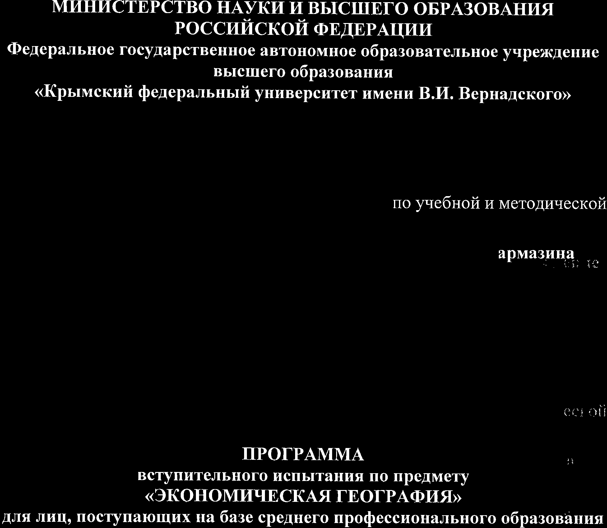 Данный документ представляет собой официальную программу вступительного испытания по дисциплине «Экономическая география» для абитуриентов, поступающих в Крымский федеральный университет имени В.И. Вернадского на базе среднего профессионального образования. Программа включает цели и задачи экзамена, подробное содержание разделов (общие вопросы, экономика России и мира, крымоведение), а также список рекомендуемой литературы для подготовки.