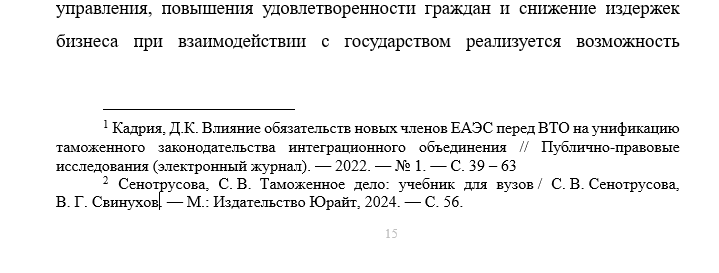 Сноска — это маленькая цифра в конце предложения/абзаца, где была использована цитата или информация из источника. Внизу страницы под специальной черточкой эта цифра. Оформление сносок — Times New Roman (размер 12). Абзац — 1,25 см.