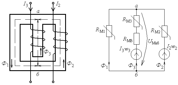). Точка m1 пересечения кривой Ф1 = f(UMаб) с кривой Ф2+3 = f(UMаб) определяет магнитное напряжение UMаб между точками а и б и поток Ф1. Ординаты точек пересечения m2 и m3 вертикальной прямой m1-m с кривыми Ф2 = f(UMаб) и Ф3 = f(UMаб) дают соответственно потоки Ф2 и Ф3.