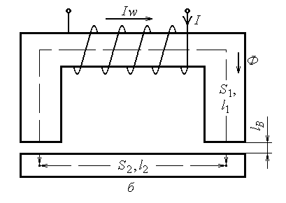), состоящую из П-образного сердечника электромагнита и стальной пластины, замыкающей его концы. Между концами сердечника электромагнита и пластиной имеется воздушный зазор lВ. Размеры сердечника электромагнита и пластины, а также материалы, из которых они изготовлены, известны. Необходимо определить намагничивающий ток, при котором магнитный поток в воздушном зазоре Ф имеет заданное значение. Сечение сердечника электромагнита во всех частях одинаково и равно S1, а сечение пластины − S2.