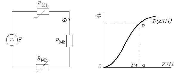 Так как магнитный поток во всех участках неразветвленной магнитной цепи один и тот же, то характеристика Ф = f(ΣHl) может быть построена по аналогии с неразветвленной электрической цепью графическим суммированием абсцисс прямой Ф = f(HBlB) и кривых Ф = f(H1l1) и Ф = f(H2l2) для одних и тех же значений магнитного потока.