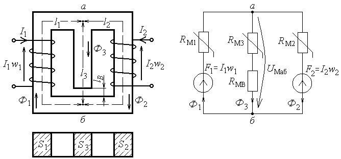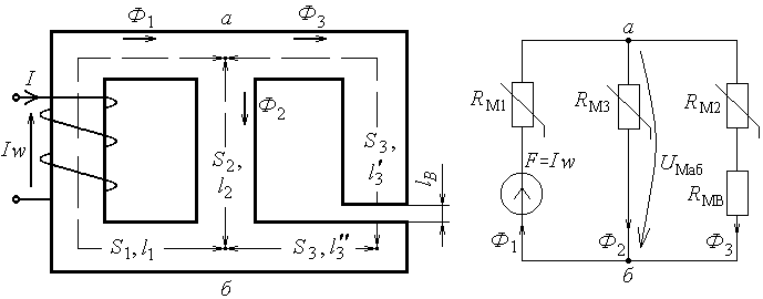 Поток Ф2 = B2 · S2, а поток Ф1 = Ф2 + Ф3. Определив поток Ф1, вычислим магнитную индукцию B1 = Ф1 / S1 и по кривой намагничивания найдем напряженность магнитного поля H1. Тогда по второму закону Кирхгофа искомая НС F = Iw = H1l1 + UMаб.