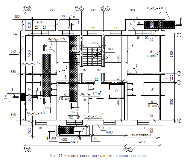 Назначение расчетных сечений и определение грузовых площадей производим в сечениях, где будут действовать разные нагрузки (рис. 1.1.). Нагрузки собираются на 1 погонный метр на отметке -0,300.