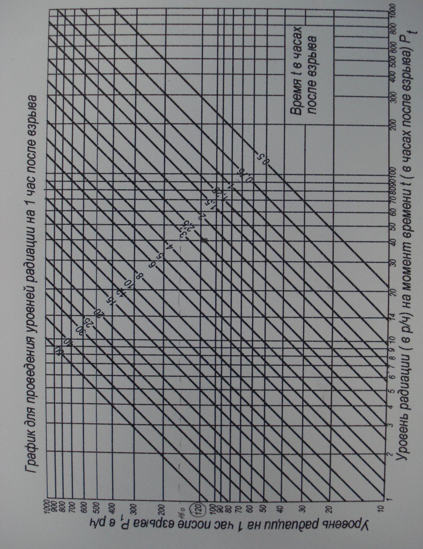В штабах ГО по этим данным для всех точек вычисляются значения уровней радиации, приведенных ко времени 1 час после взрыва (по которым определяются границы зон радиоактивного заражения).