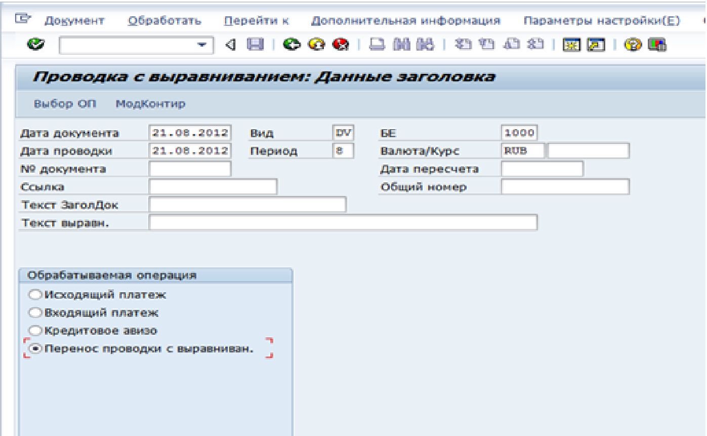 Создание документа выравнивания осуществляется посредством транзакции «FB05 — проводка с выравниванием». В открывшемся окне «Проводка с выравниванием: Данные заголовка» (рисунок 9) необходимо ввести данные.