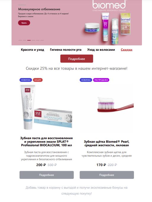 | Вторник | Новинки: Объявления о выпуске нового продукта (статья) | Супергерои в составе наших зубных паст. Делимся выпуском нового продукта для детей. |