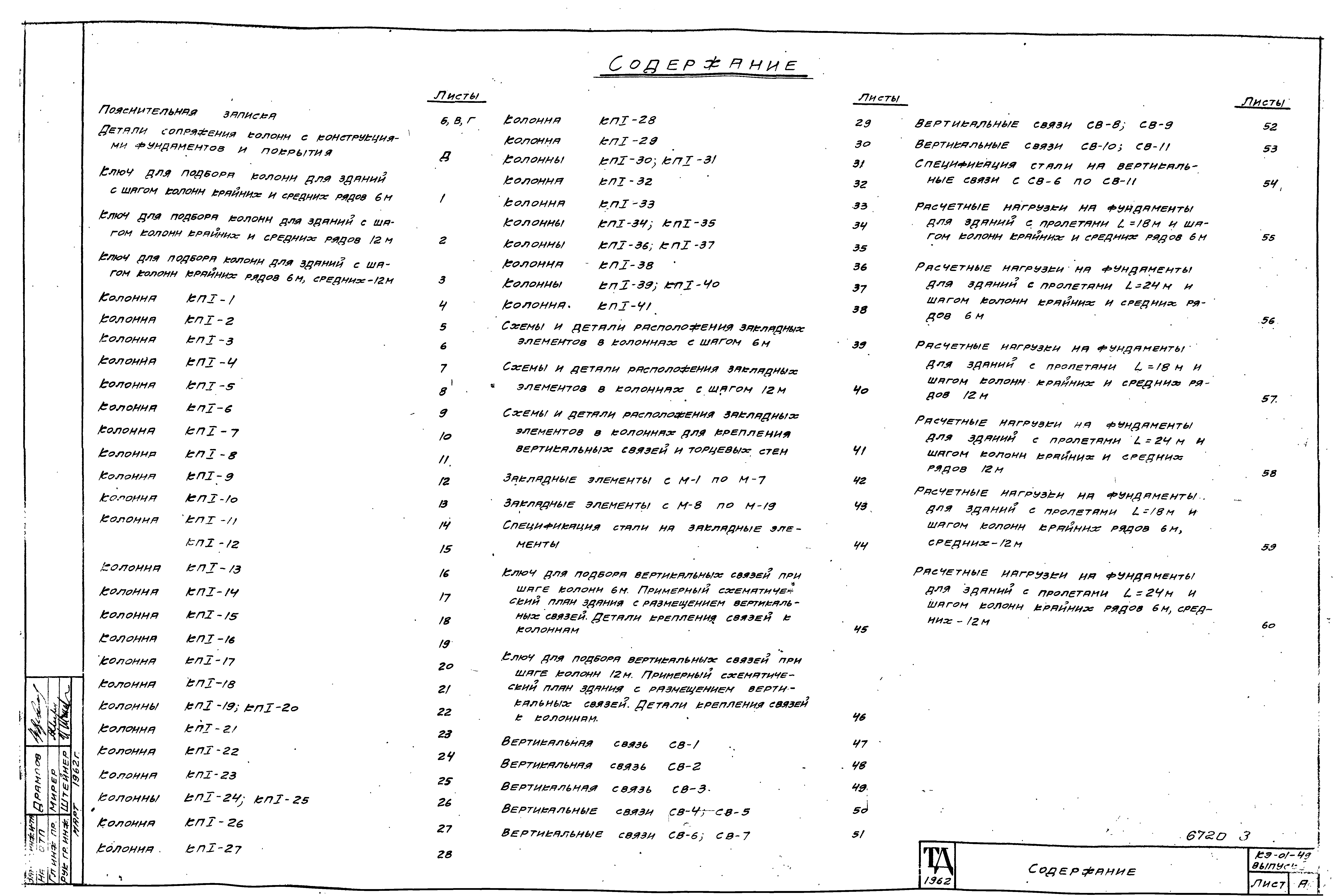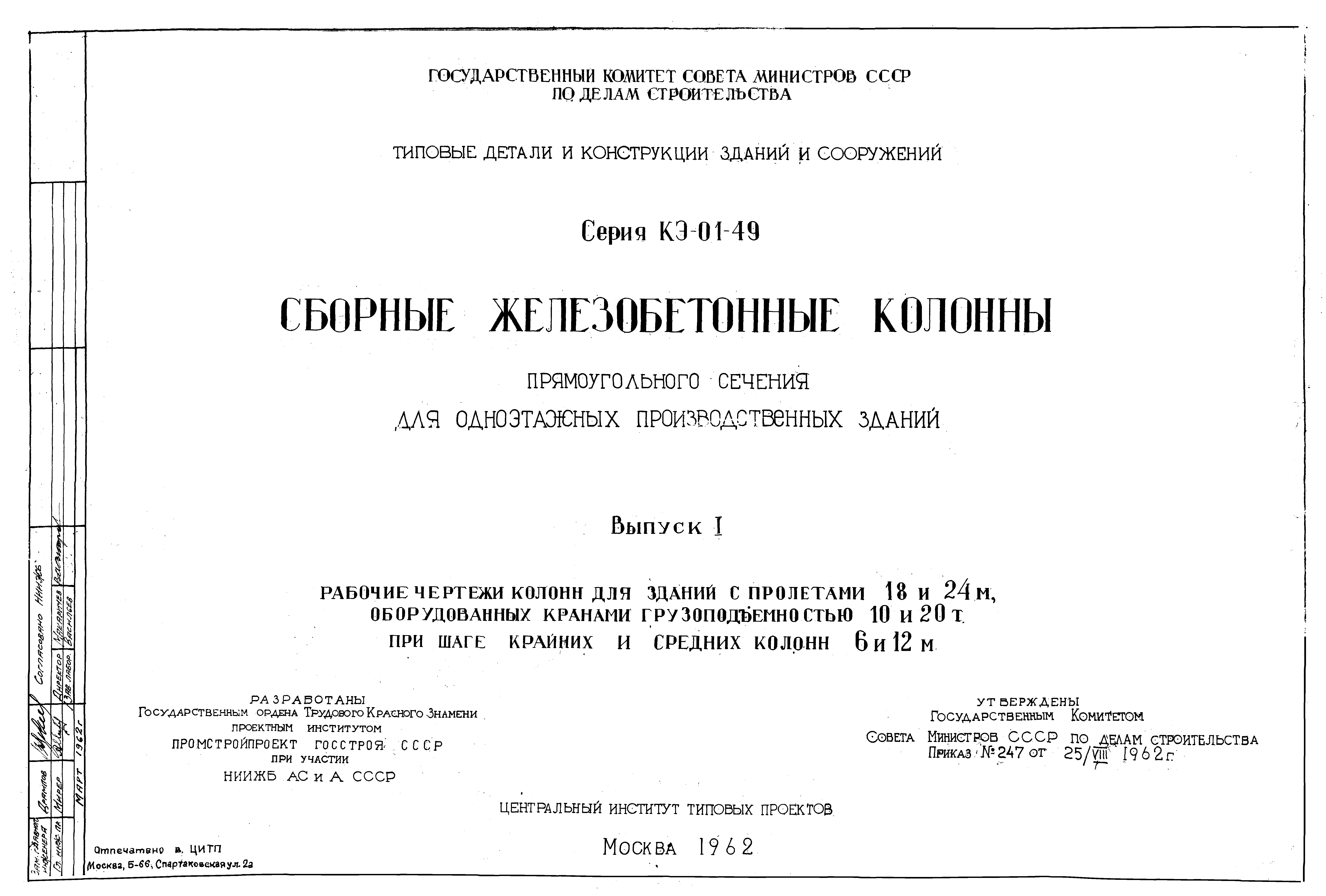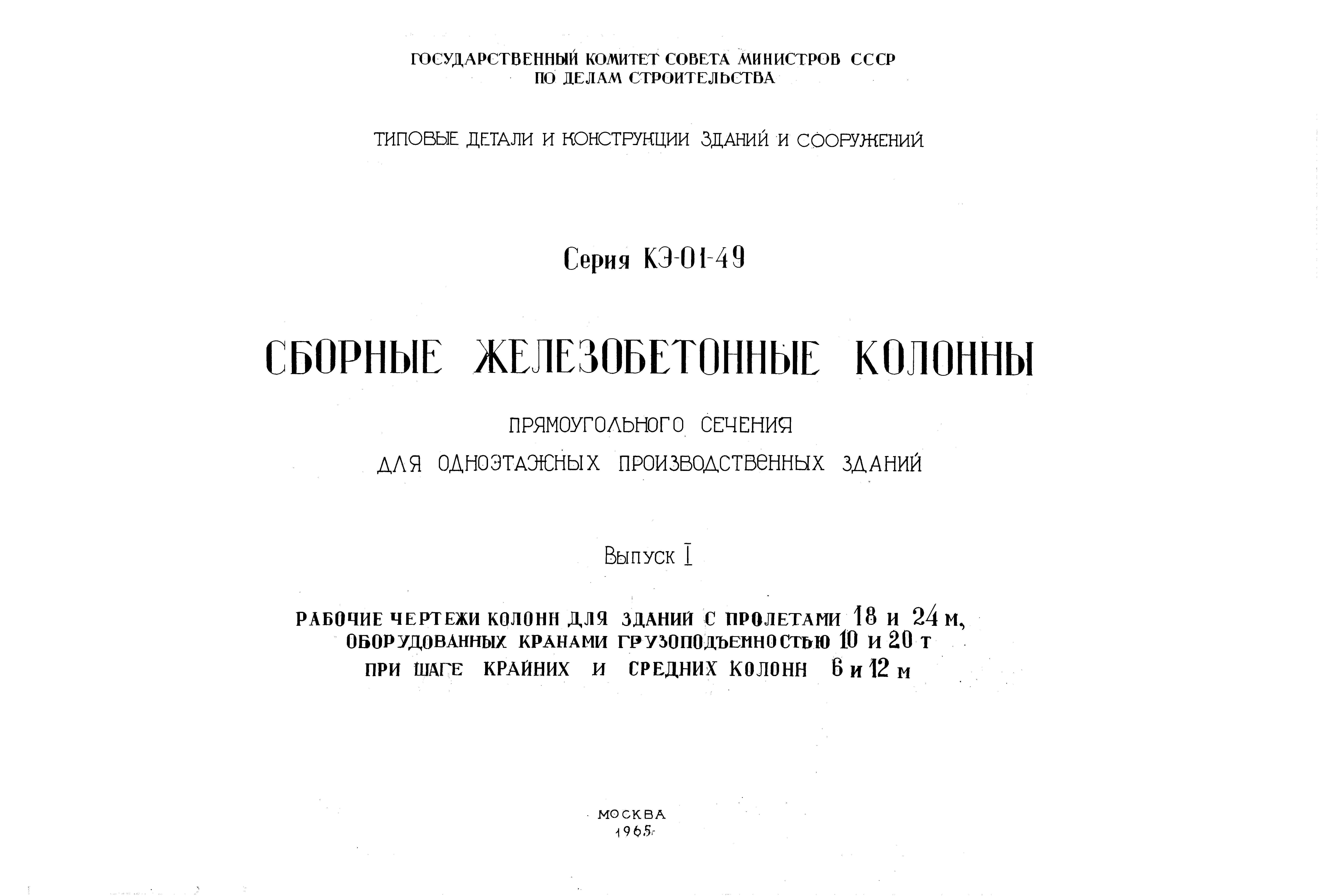 Настоящий выпуск серии КЭ-01-49 содержит рабочие чертежи сборных железобетонных колонн прямоугольного сечения, предназначенных для одноэтажных производственных зданий с пролетами 18 и 24 м, оборудованных мостовыми кранами грузоподъемностью 10 и 20 т, тяжелого и среднего режима работы, с шагом колонн 6 и 12 м.