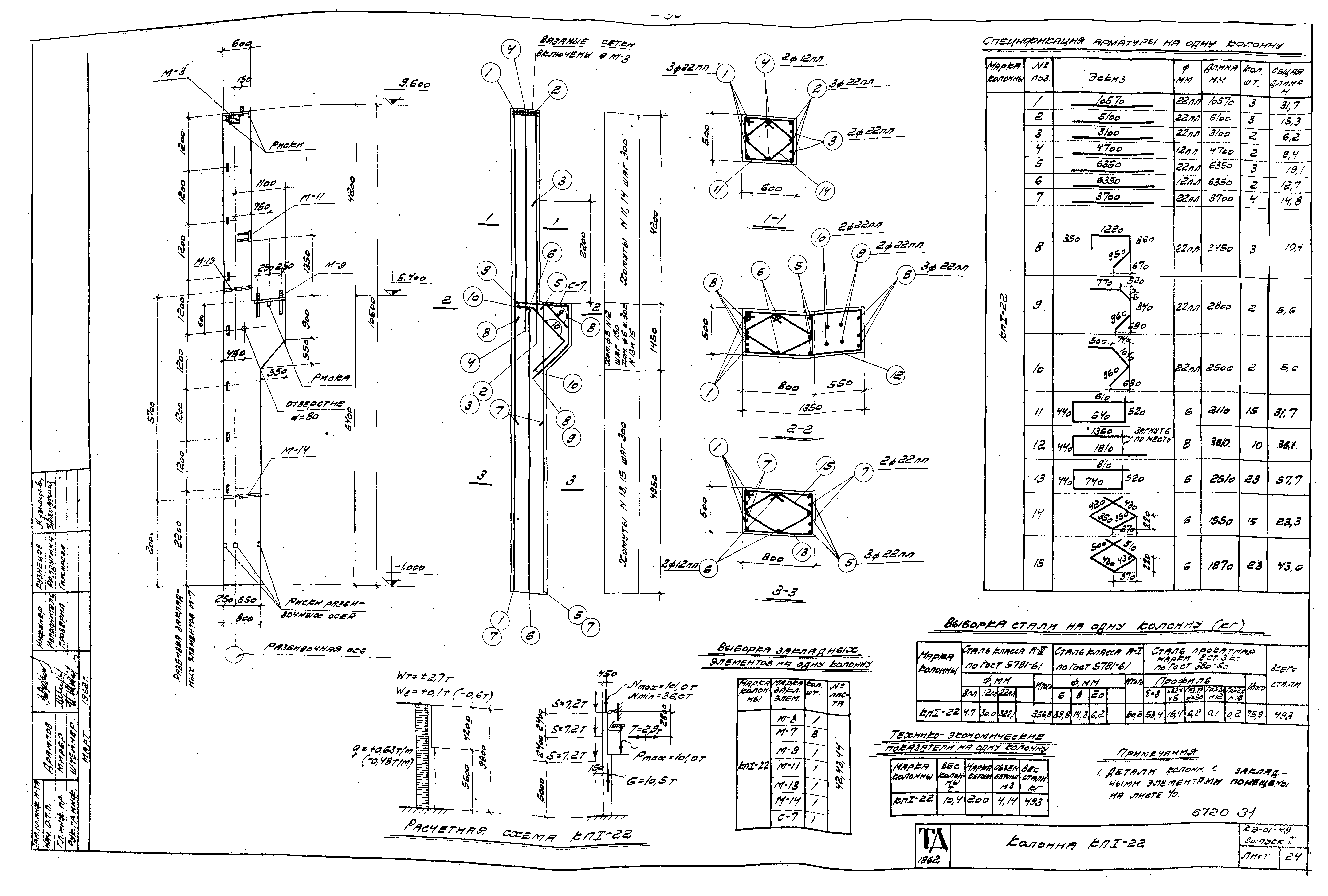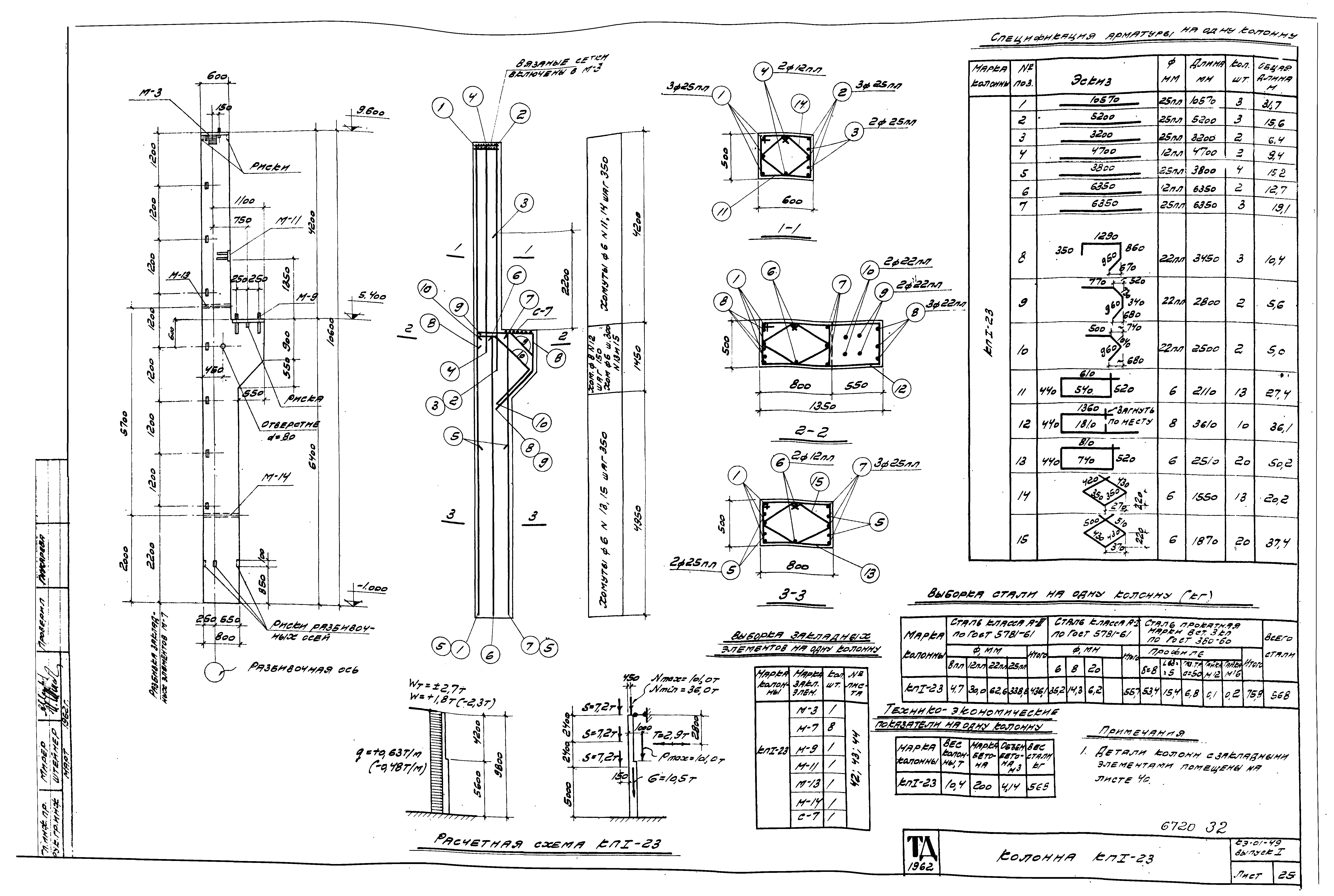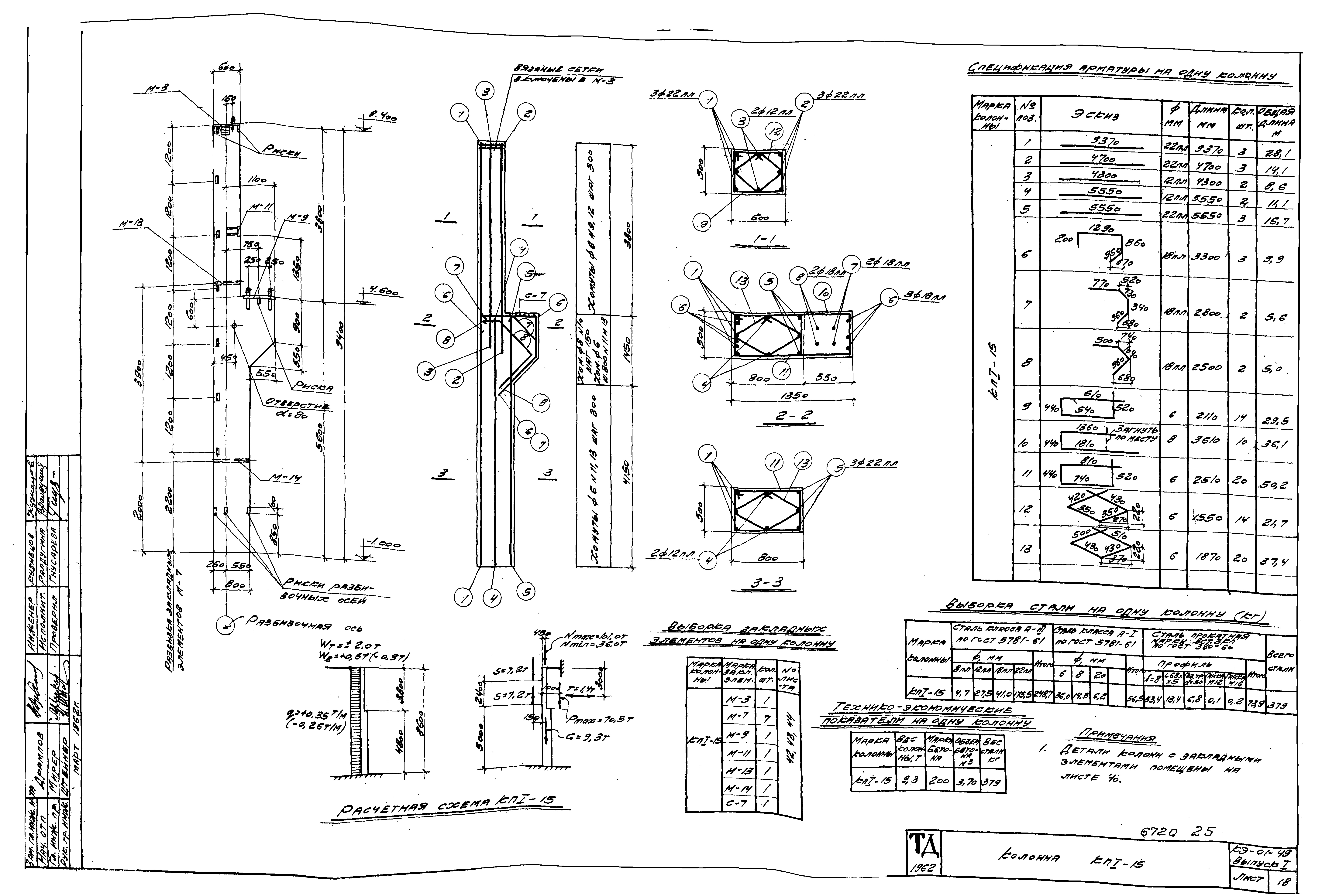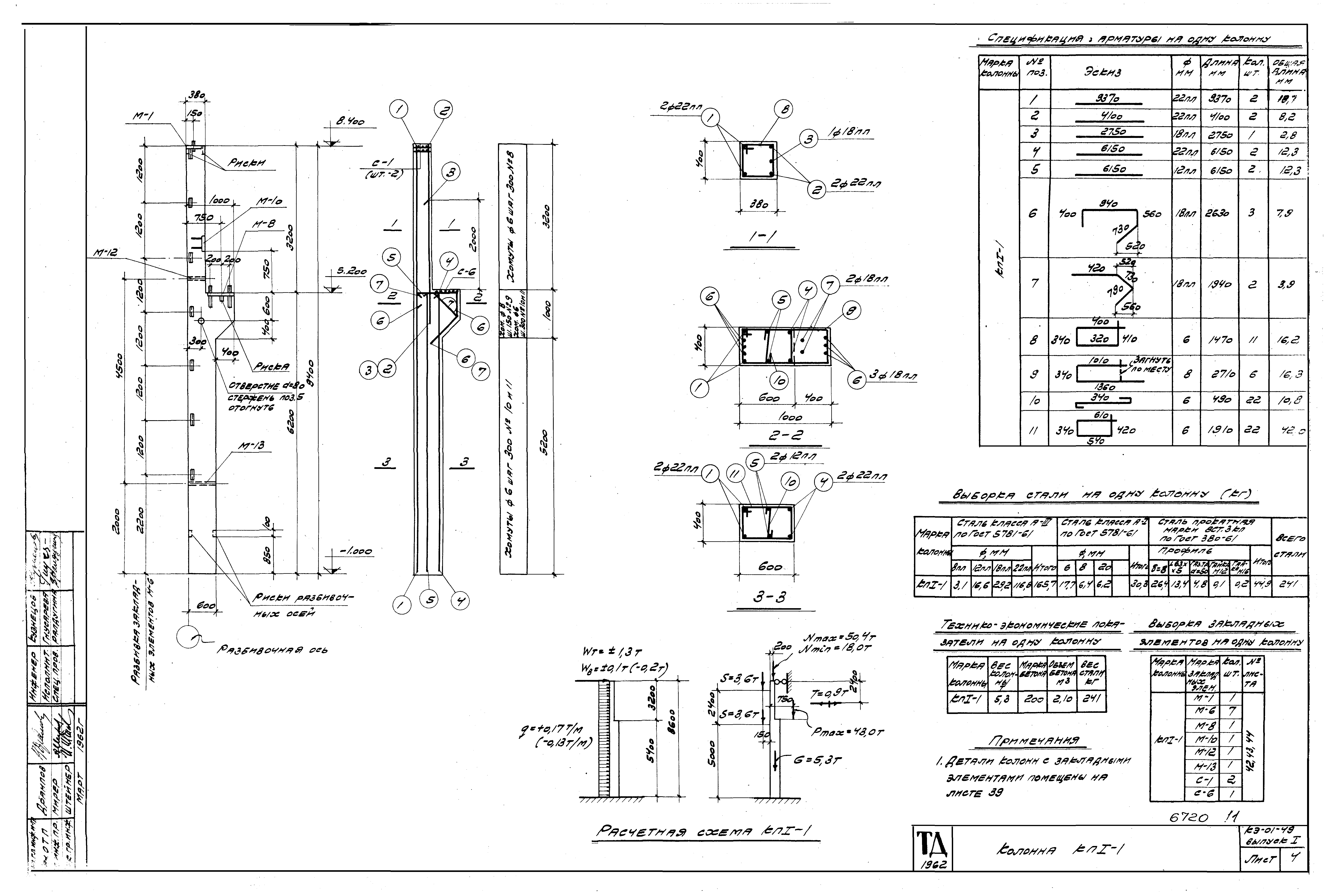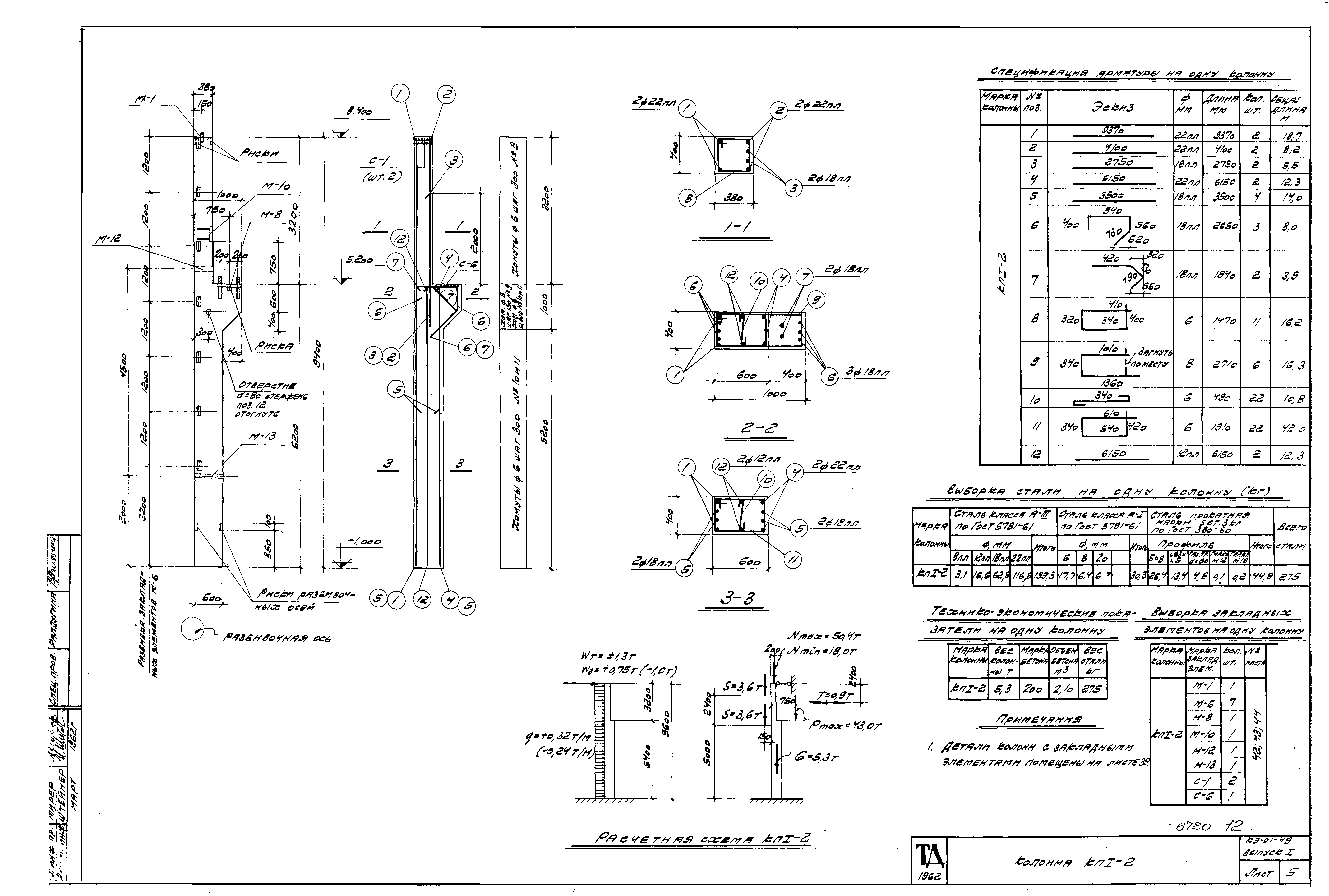 | Марка колонны | Сечение, мм | Вес, т | Объем бетона, м³ | Вес стали, кг |