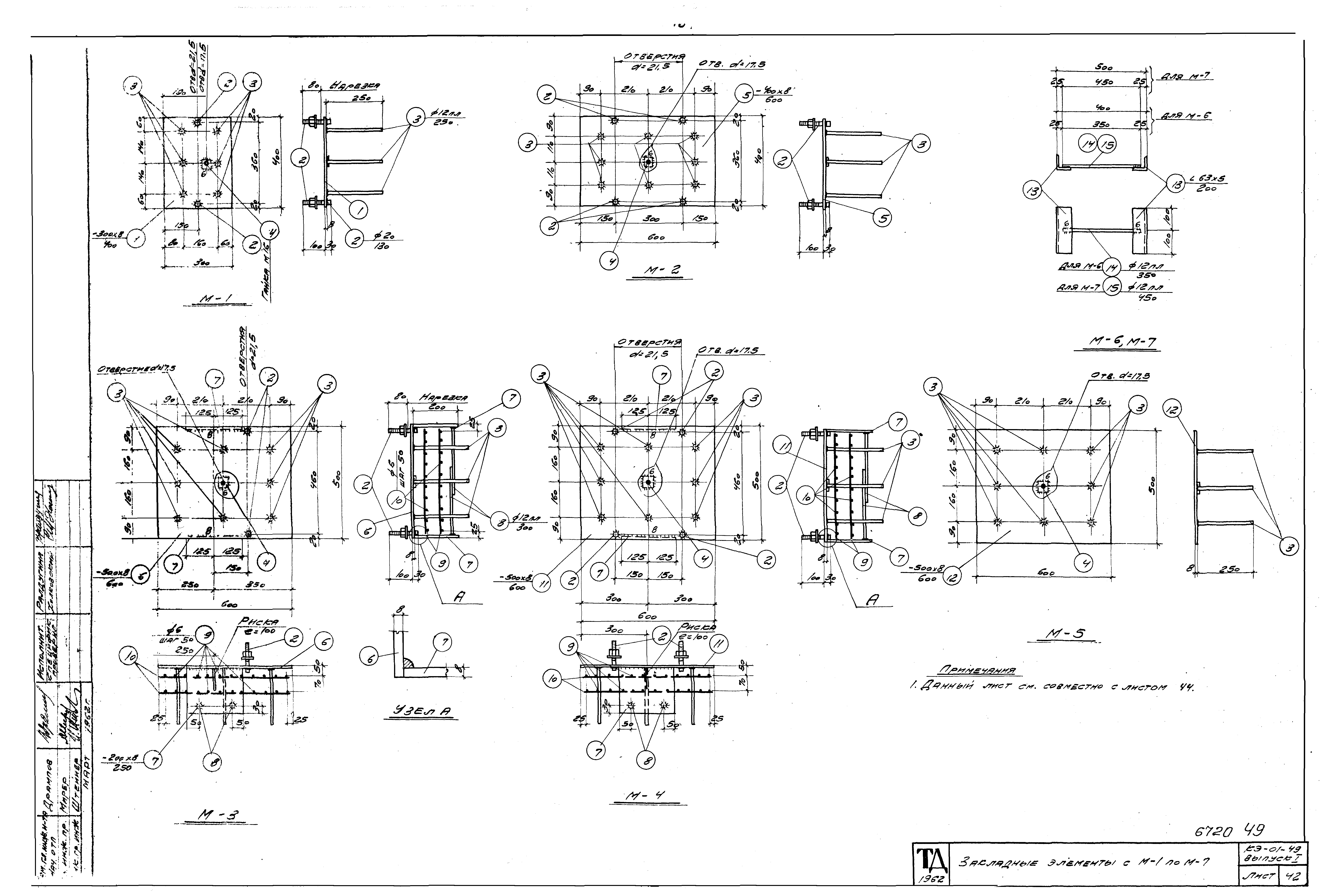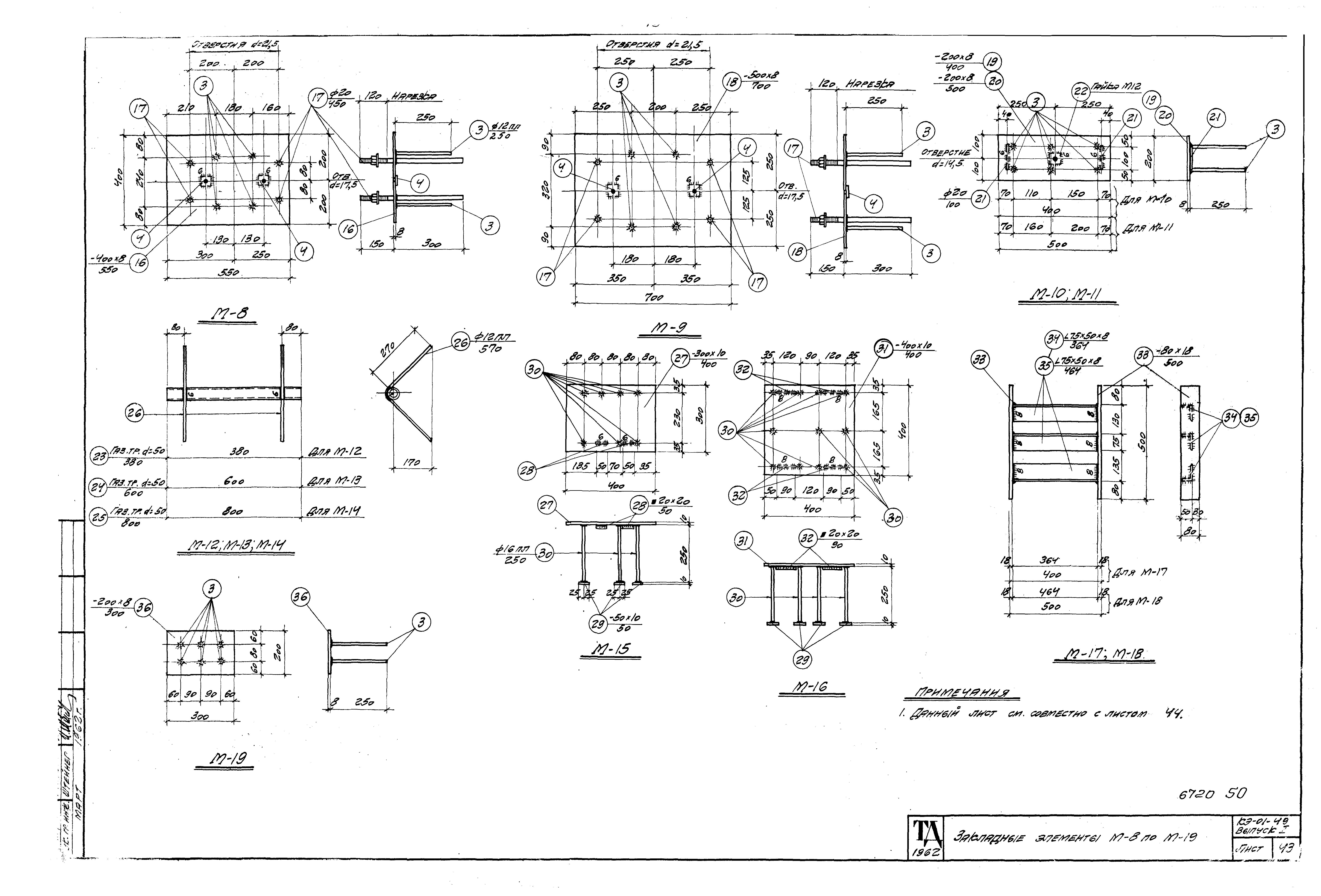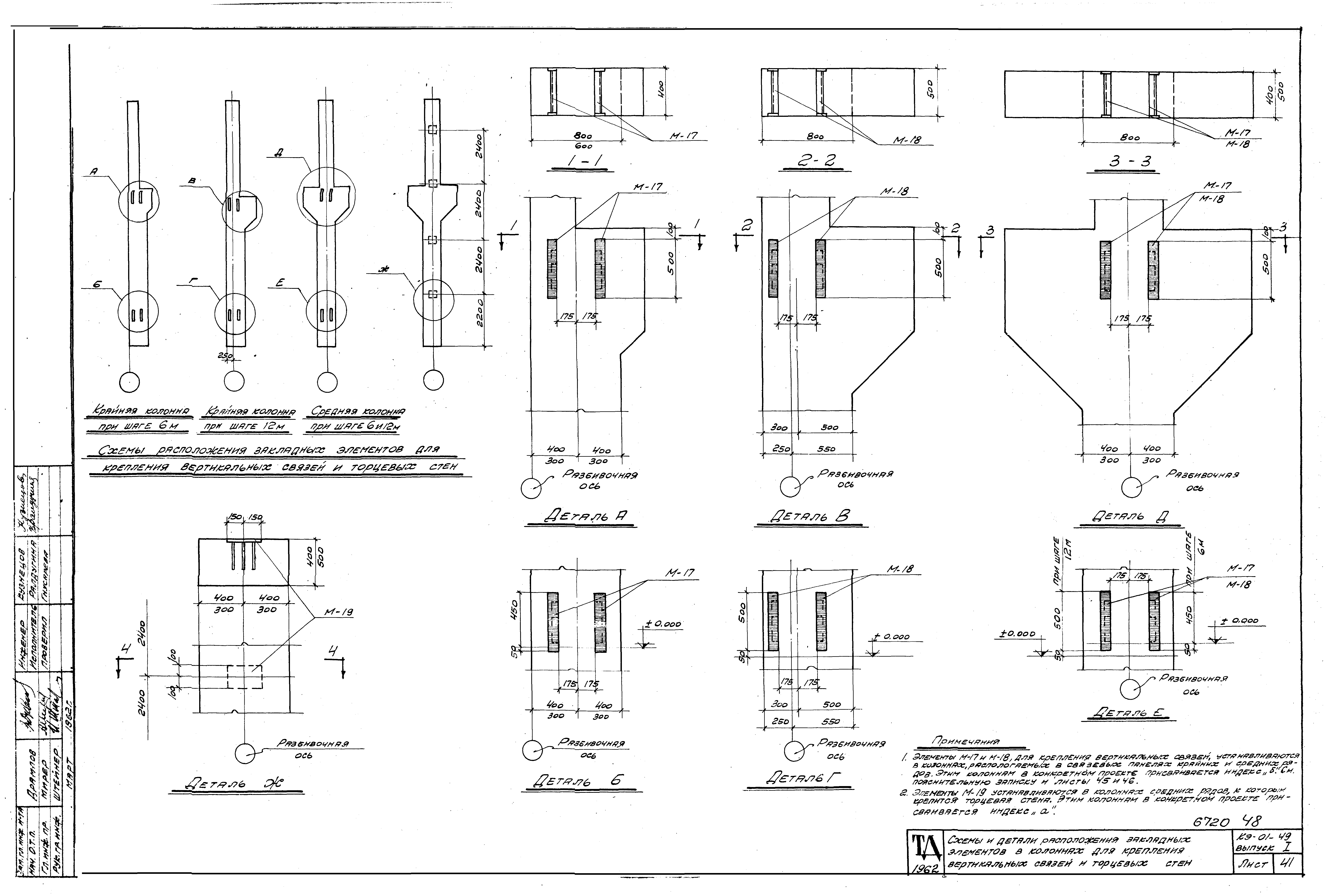 На листах 39-41 приведены схемы расположения закладных элементов для крепления вертикальных связей и торцевых стен. Закладные элементы маркируются М-1, М-2 и т.д. в соответствии с чертежами.