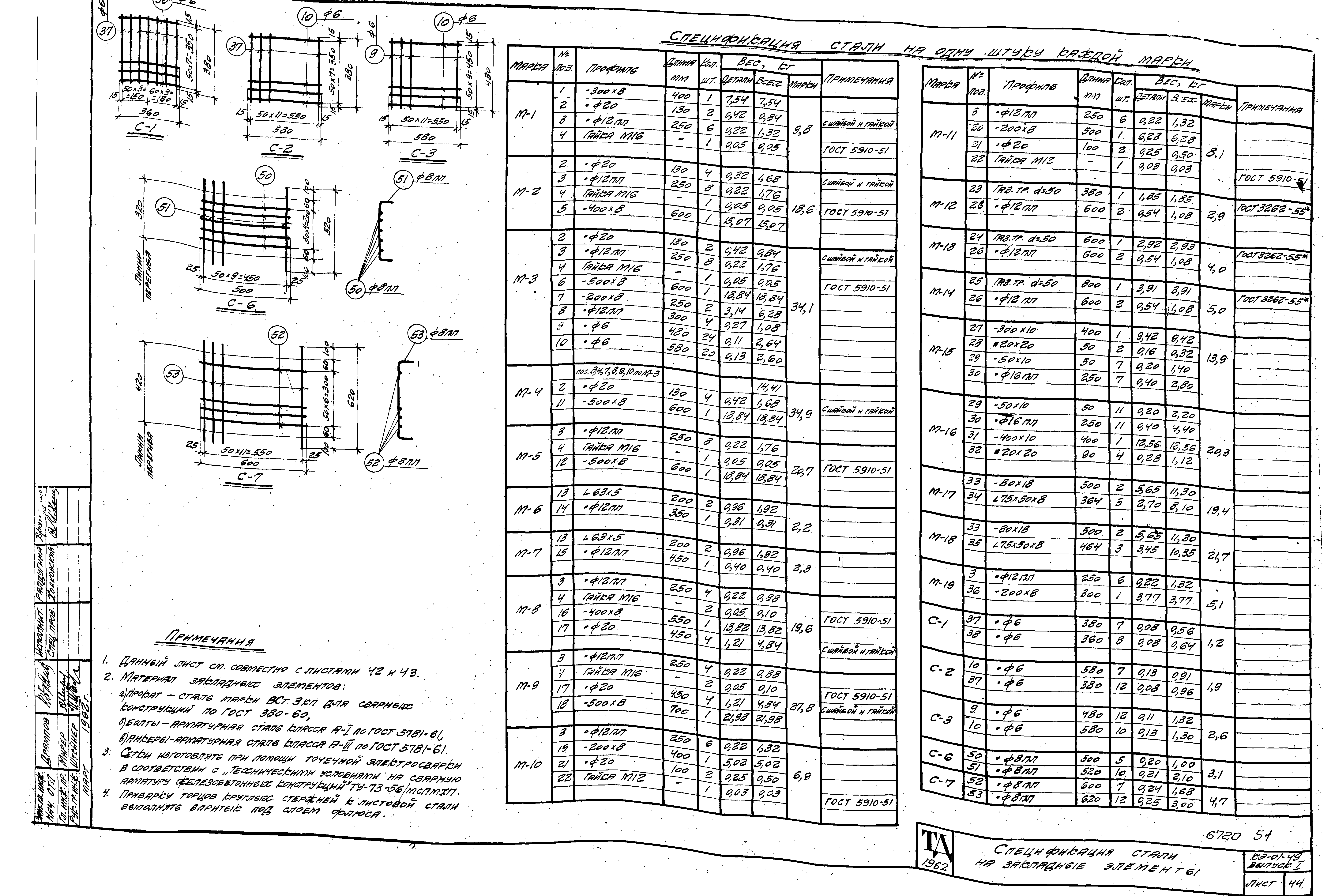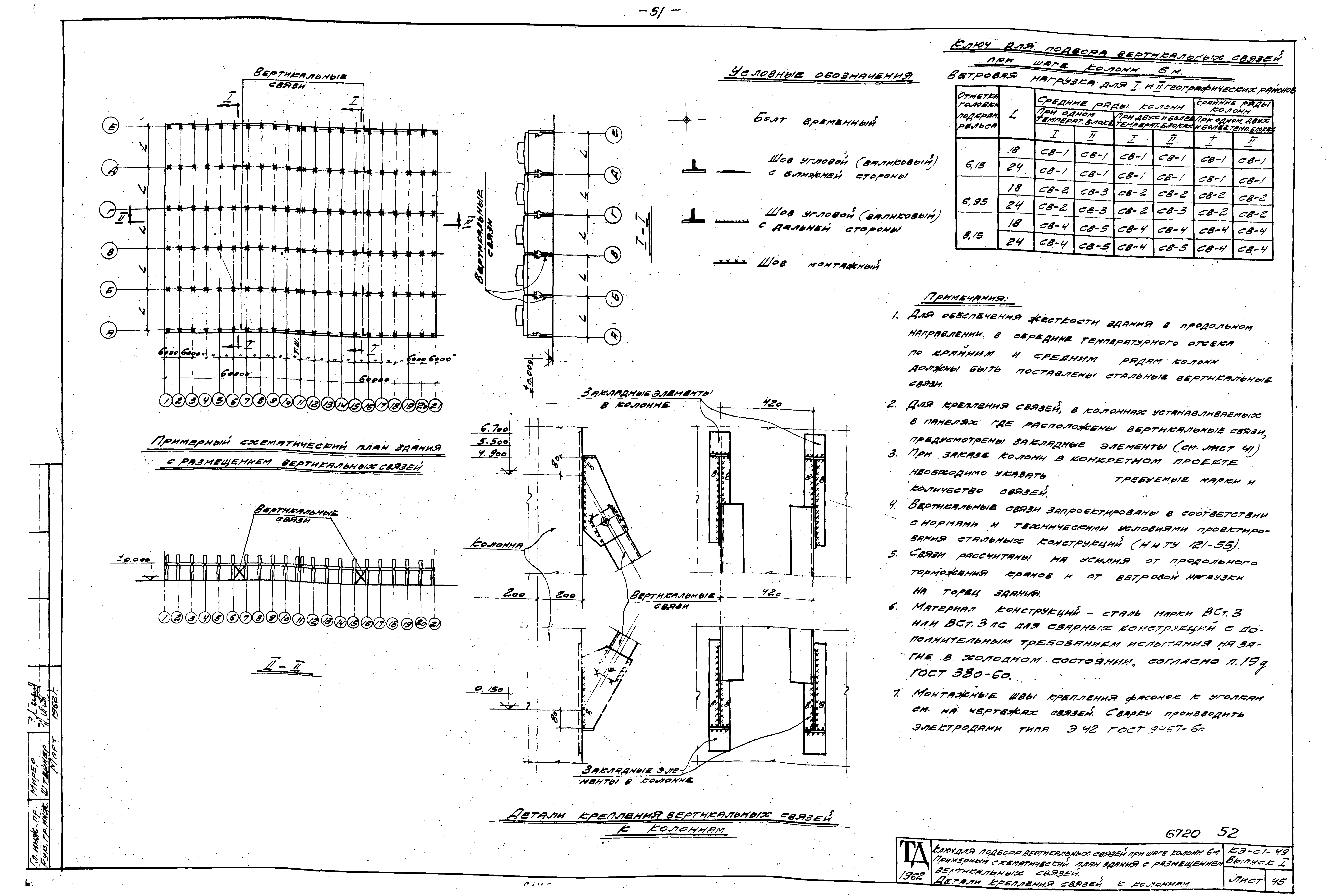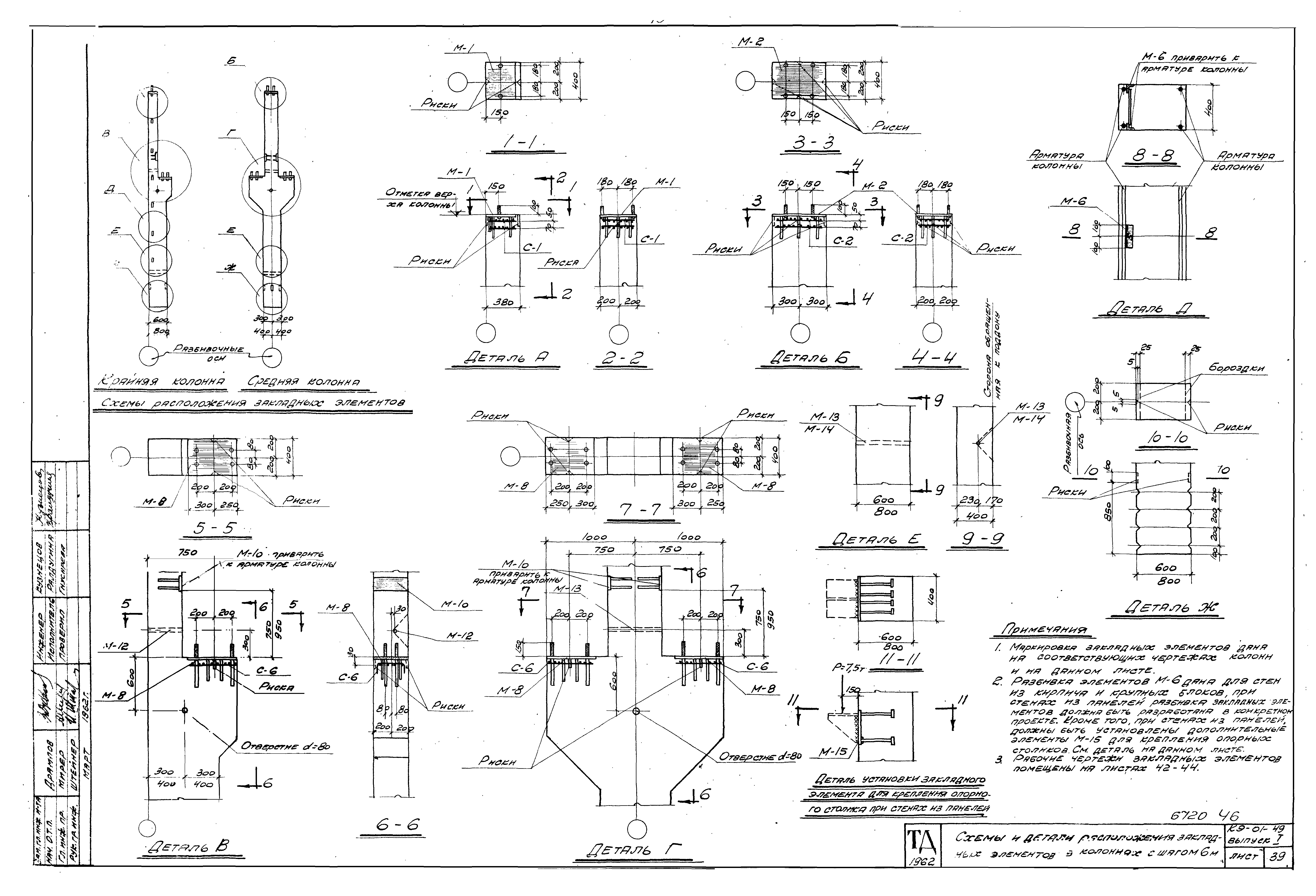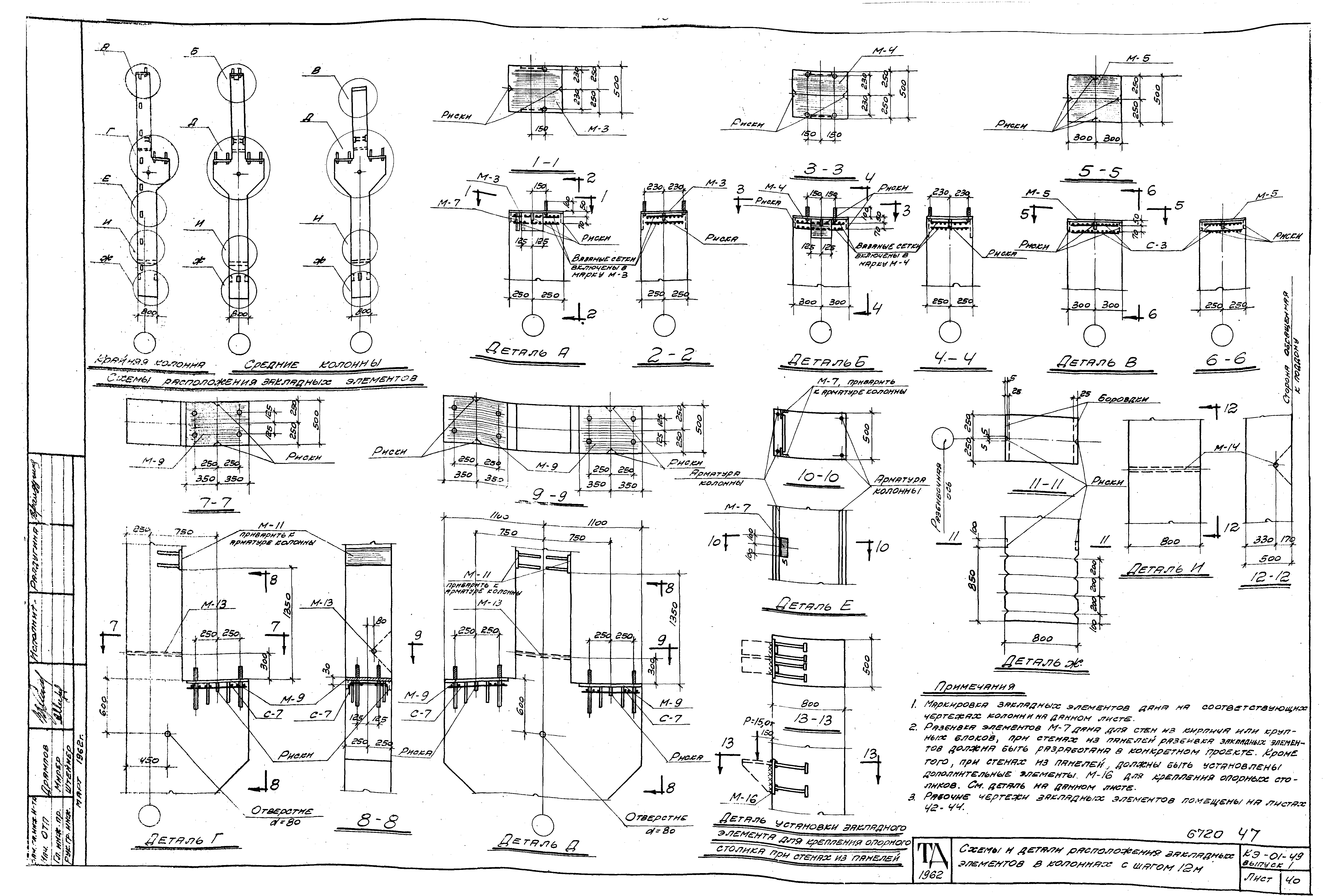 На листах 39-41 приведены схемы расположения закладных элементов для крепления вертикальных связей и торцевых стен. Закладные элементы маркируются М-1, М-2 и т.д. в соответствии с чертежами.