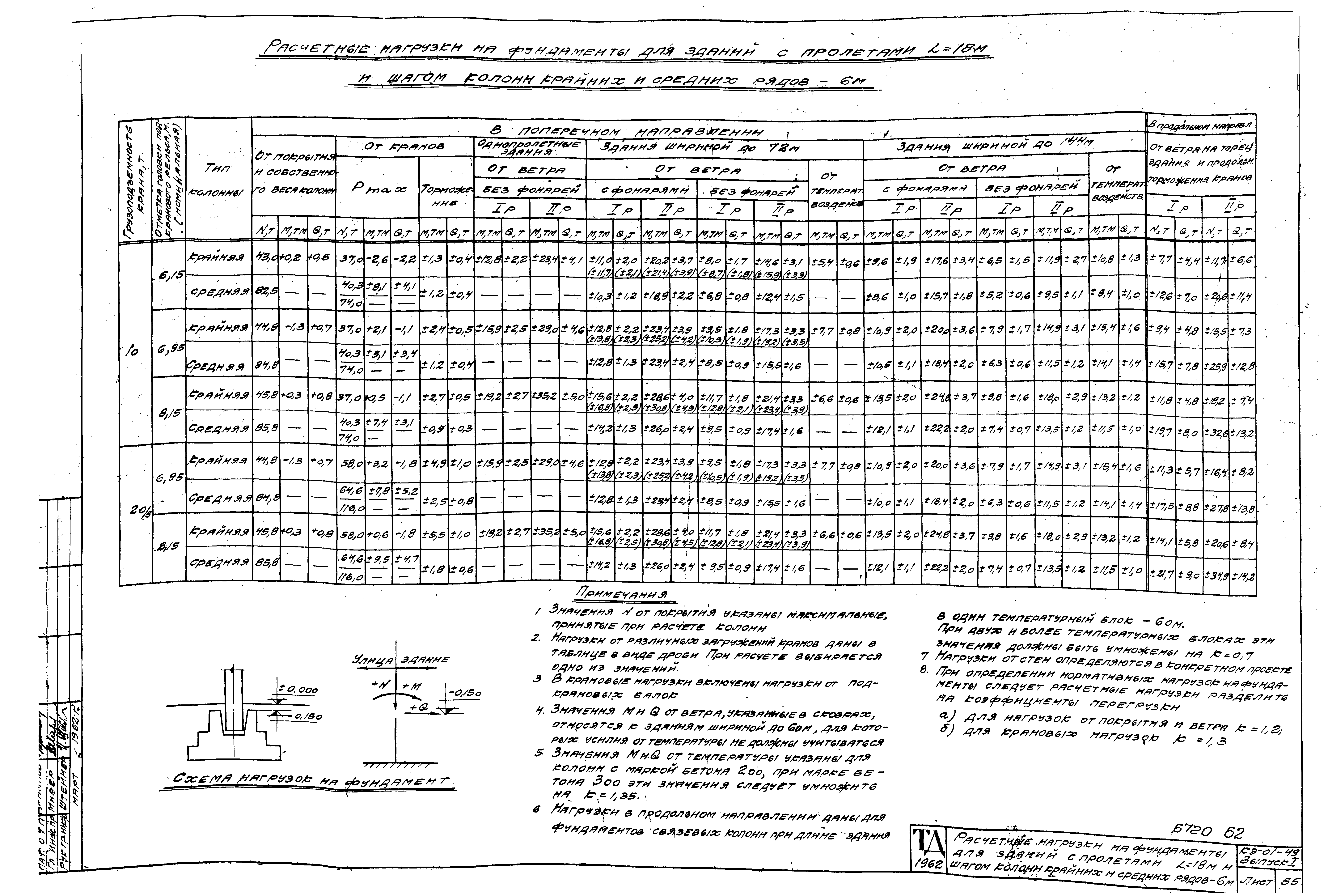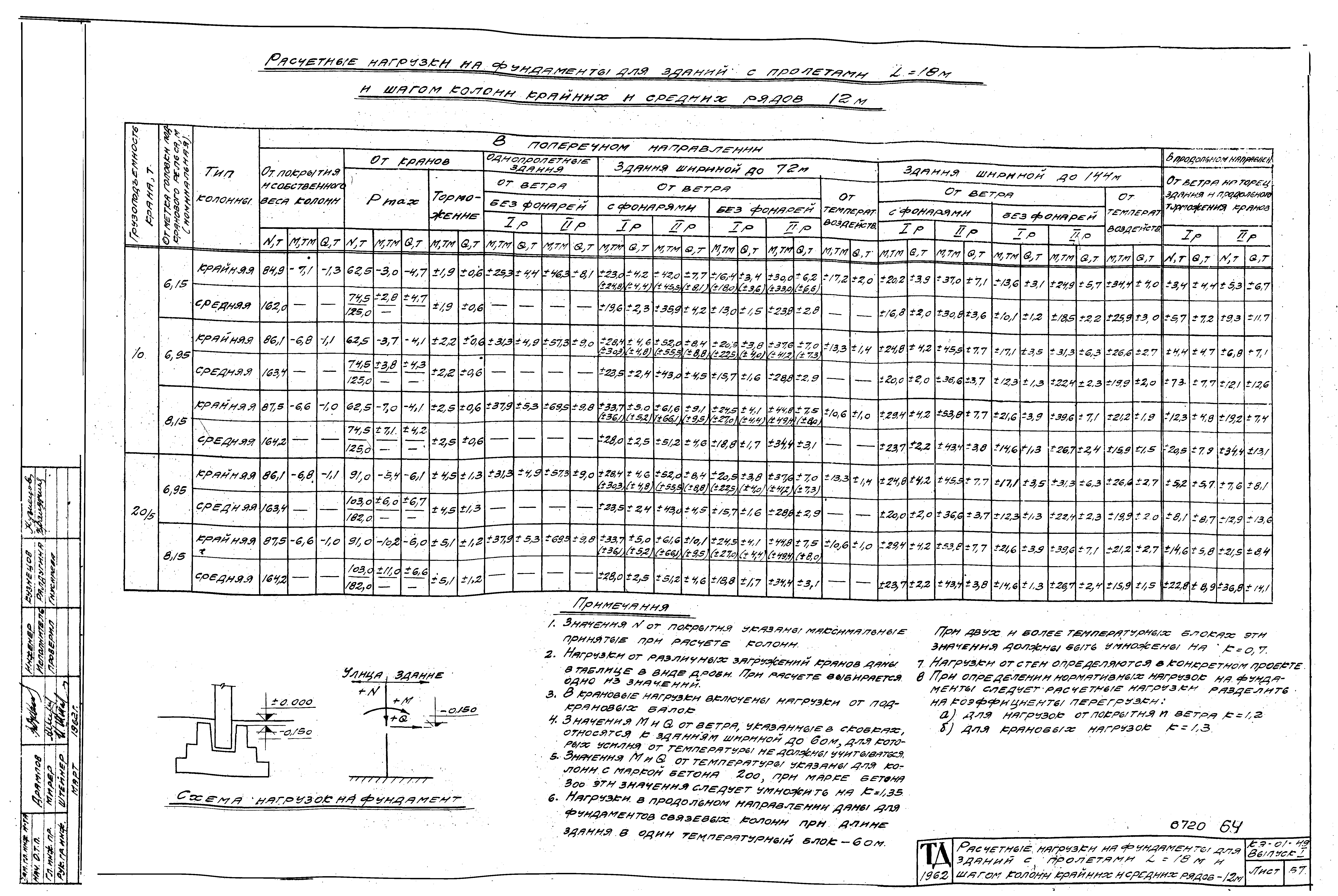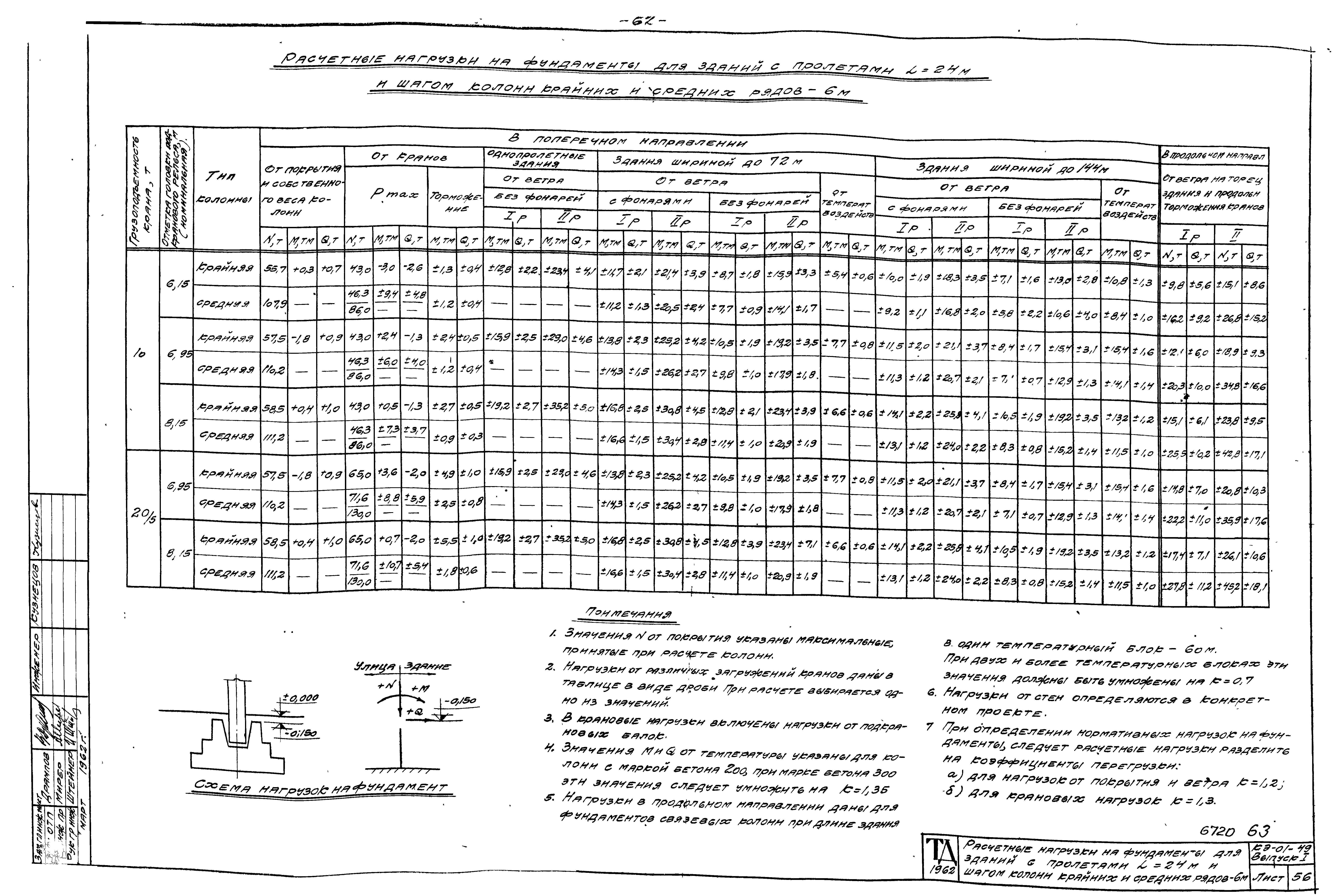 На листах 46-50 приведены расчетные нагрузки на фундаменты для зданий с пролетами 18 и 24 м при различных шагах колонн. Данные нагрузки необходимы для проектирования фундаментов стаканного типа.