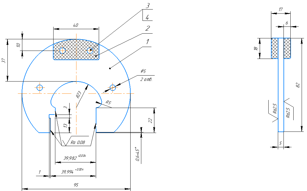 По ГОСТ 18360-93 [8] выбираем конструкцию калибров ПР и НЕ, и их основные размеры. Размеры скобы: D= 40 мм; D1= 95 мм; H= 82мм; h=37 мм; l=22 мм; l1=13 мм; l2=3мм; s=5 мм; масса — 0,2 кг. Твердость рабочих поверхностей 58-64 HRC. Шероховатость измерительных поверхностей выбираем по ГОСТ 2789-73: Rа 0,08. На рисунке 4 изображен чертеж калибр-скобы.