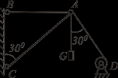 Груз весом G=60 кН подвешен при помощи каната, перекинутого через блок А и идущего к лебёдке D. Определить реакции в стержнях АС и АВ крана.