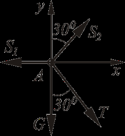 Для решения данной задачи рассмотрим равновесие конструкции, находящейся под действием системы сходящихся сил, которые пересекаются в точке А. Реакции стержней АВ и АС направлены вдоль стержней, поэтому действие стержней заменяем реакциями S1 и S2, прикладывая их в точке А. Усилие в канате Т направлено вдоль каната от точки А к точке D.