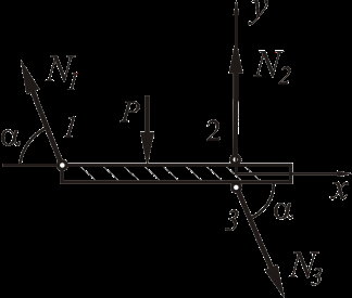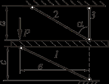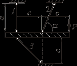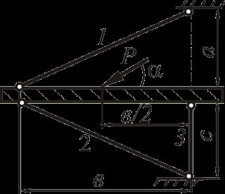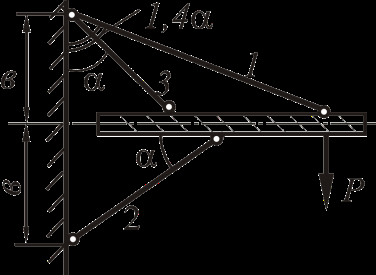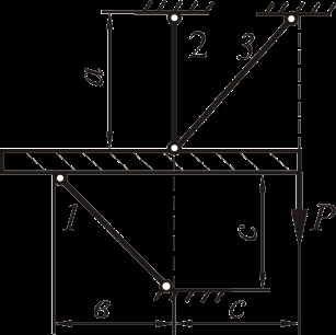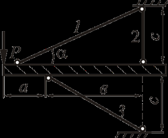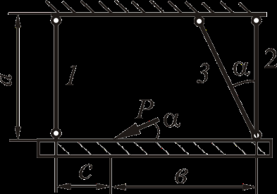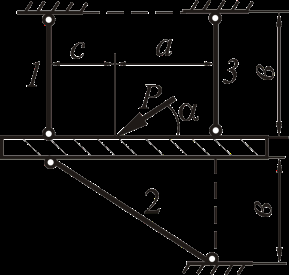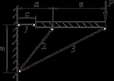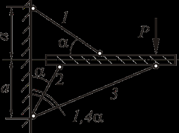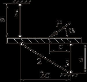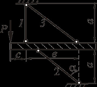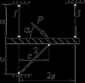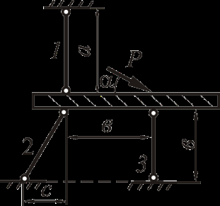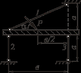 Рассмотрим равновесие жёсткого бруса. Для освобождения бруса от связей мысленно отбросим стержни и заменим их действие реакциями N1, N2 и N3. Реакции определим, составив уравнения равновесия.