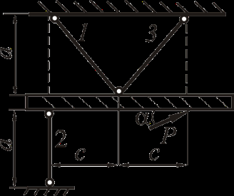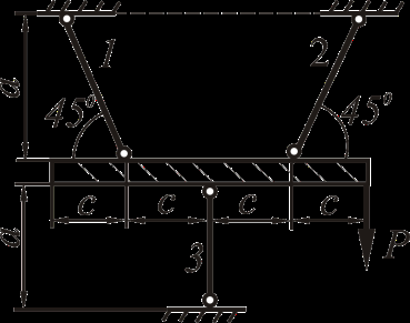 Решая систему из трёх уравнений (1, 2 и 3), найдём усилия в стержнях.
