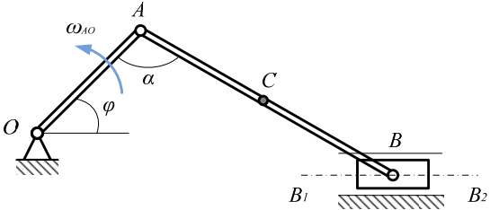 Кривошип ОА вращается равномерно с угловой скоростью ωОА=const (при ωОА>0 вращение происходит против хода часовой стрелки; при ωОА <0 – по ходу часовой стрелки). На шатуне положение центра тяжести (точка С) задано расстоянием АС. Положение механизма определяется в любой момент времени углом поворота φ кривошипа ОА и углом α, который образуют между собой кривошип и шатун.