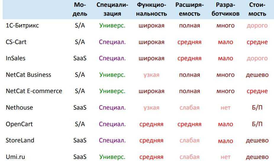 - Выбрать платформу для своего сайта. Выбор делать следует логический, используя как пример, представленную ниже таблицу (данные следует проверить для текущих условий).