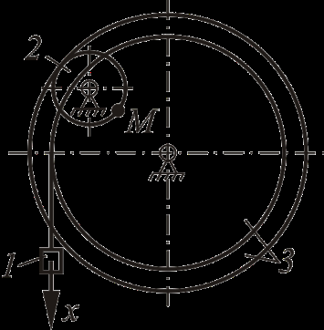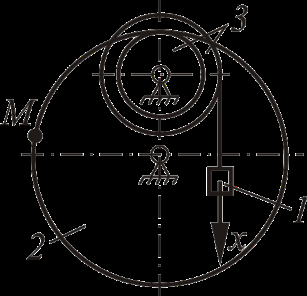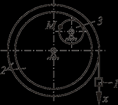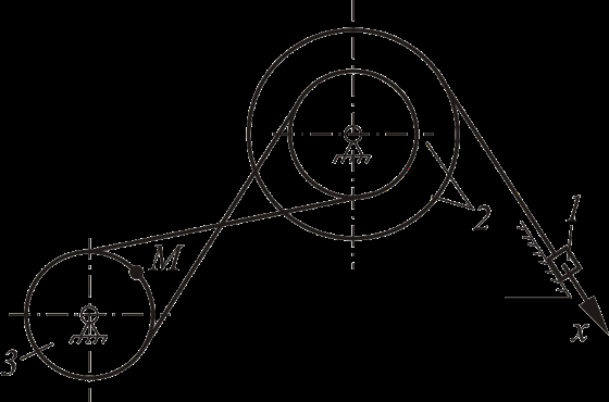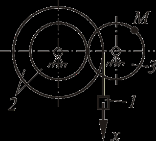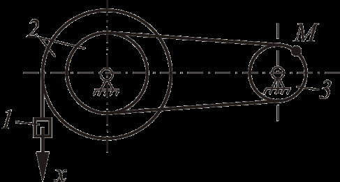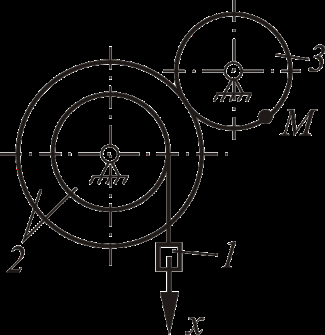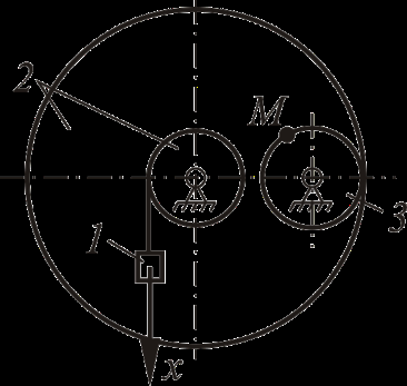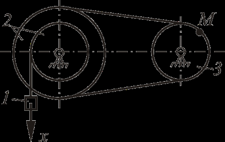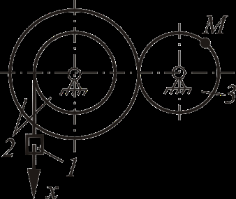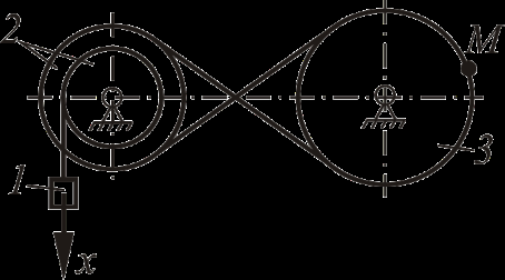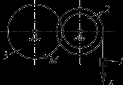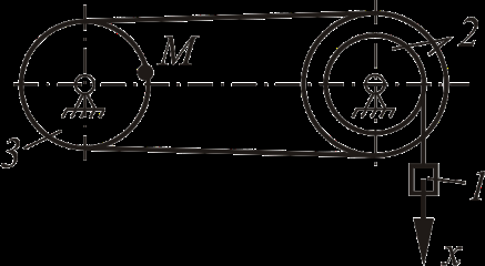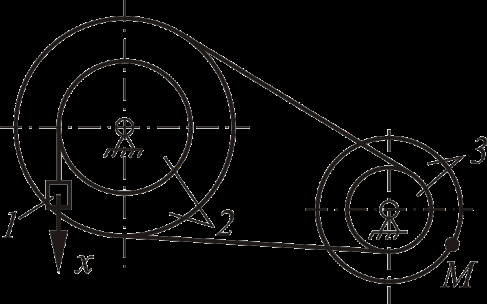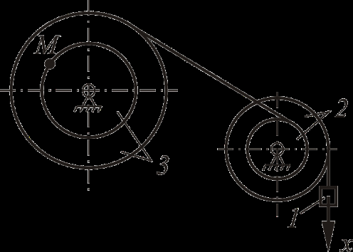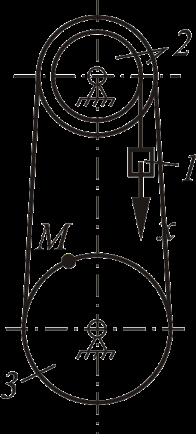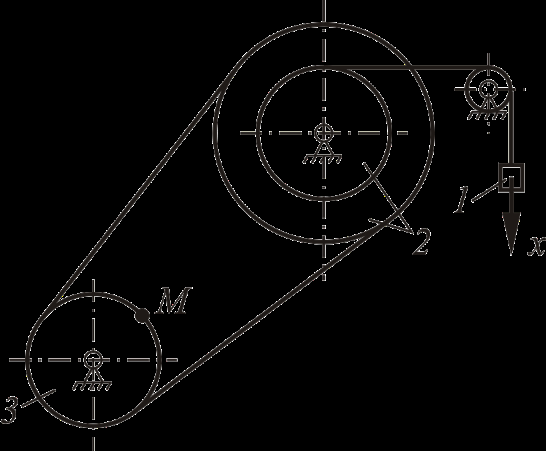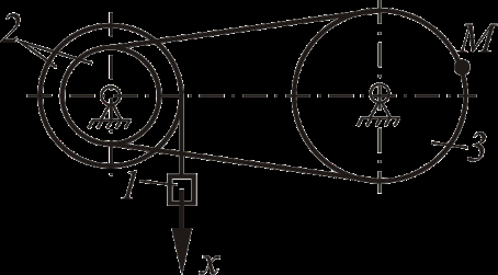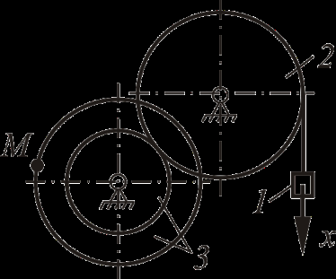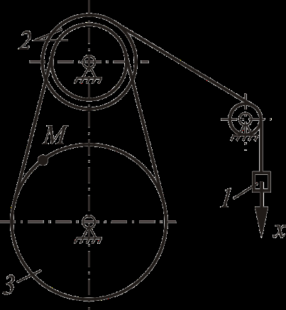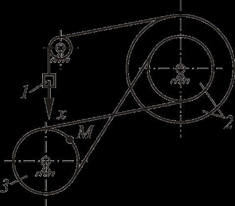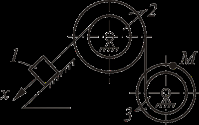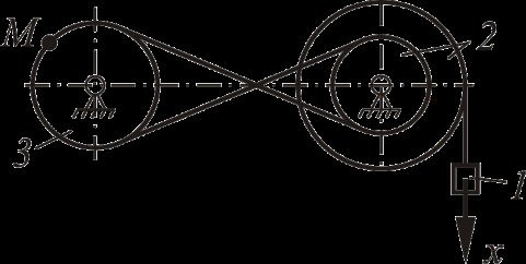 Определить в момент времени t=t1 скорость и ускорение груза 1 и точки М, принадлежащей колесу 3. Схемы механизмов и необходимые данные приведены в таблицах 2.4 и 2.5.